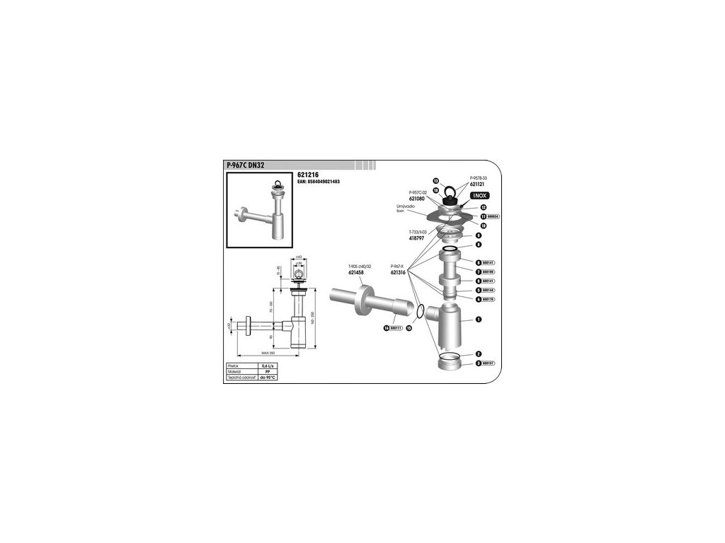Sifon umyvadlový P-967 C DN32 kovová vpusť (výprodej)